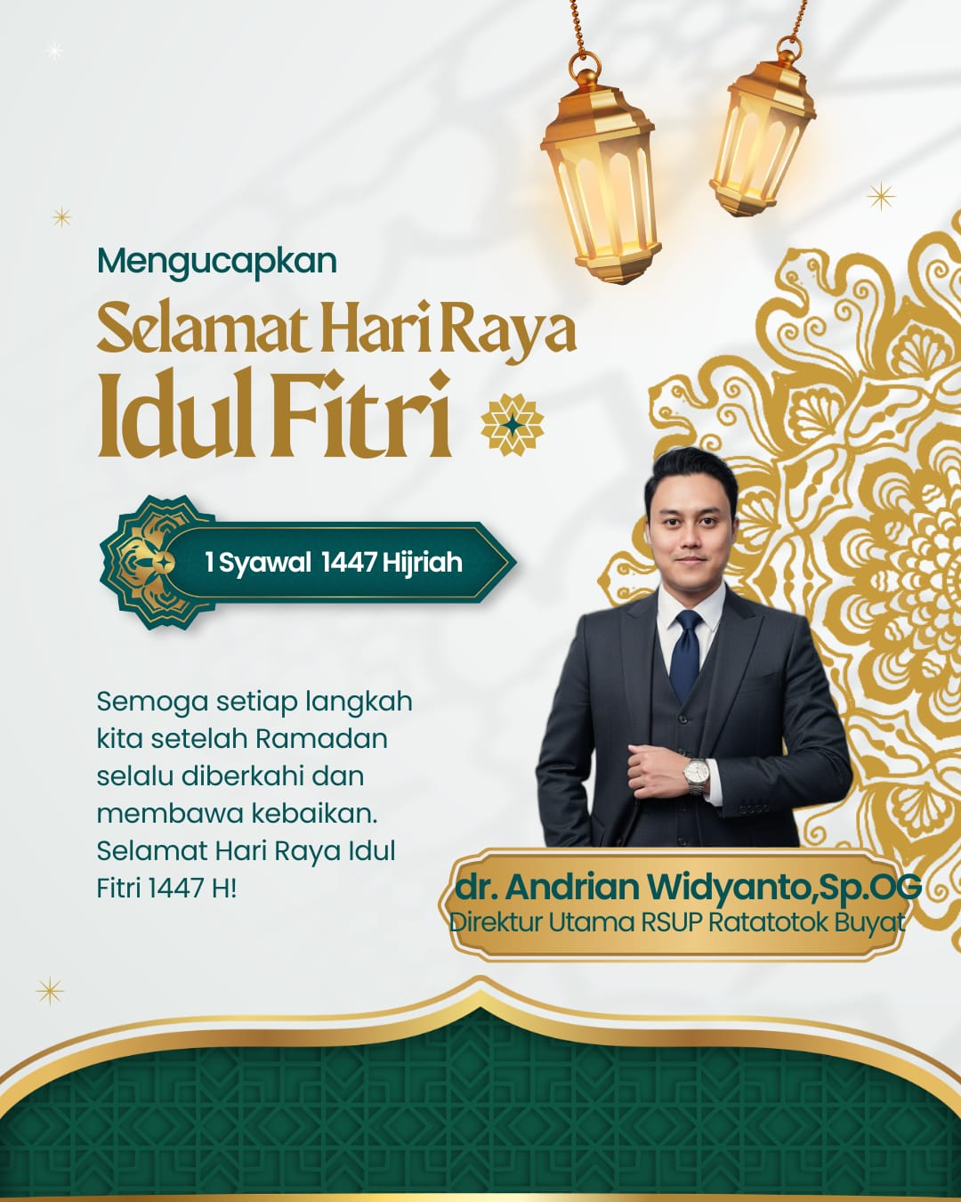 Direktur utama RSUP Ratatok Buyat beserta seluruh staf  menyampaikan ucapan selamat menyambut Hari Raya Idul Fitri 1 Syawal 1447 H,tahun 2026 Masehi.