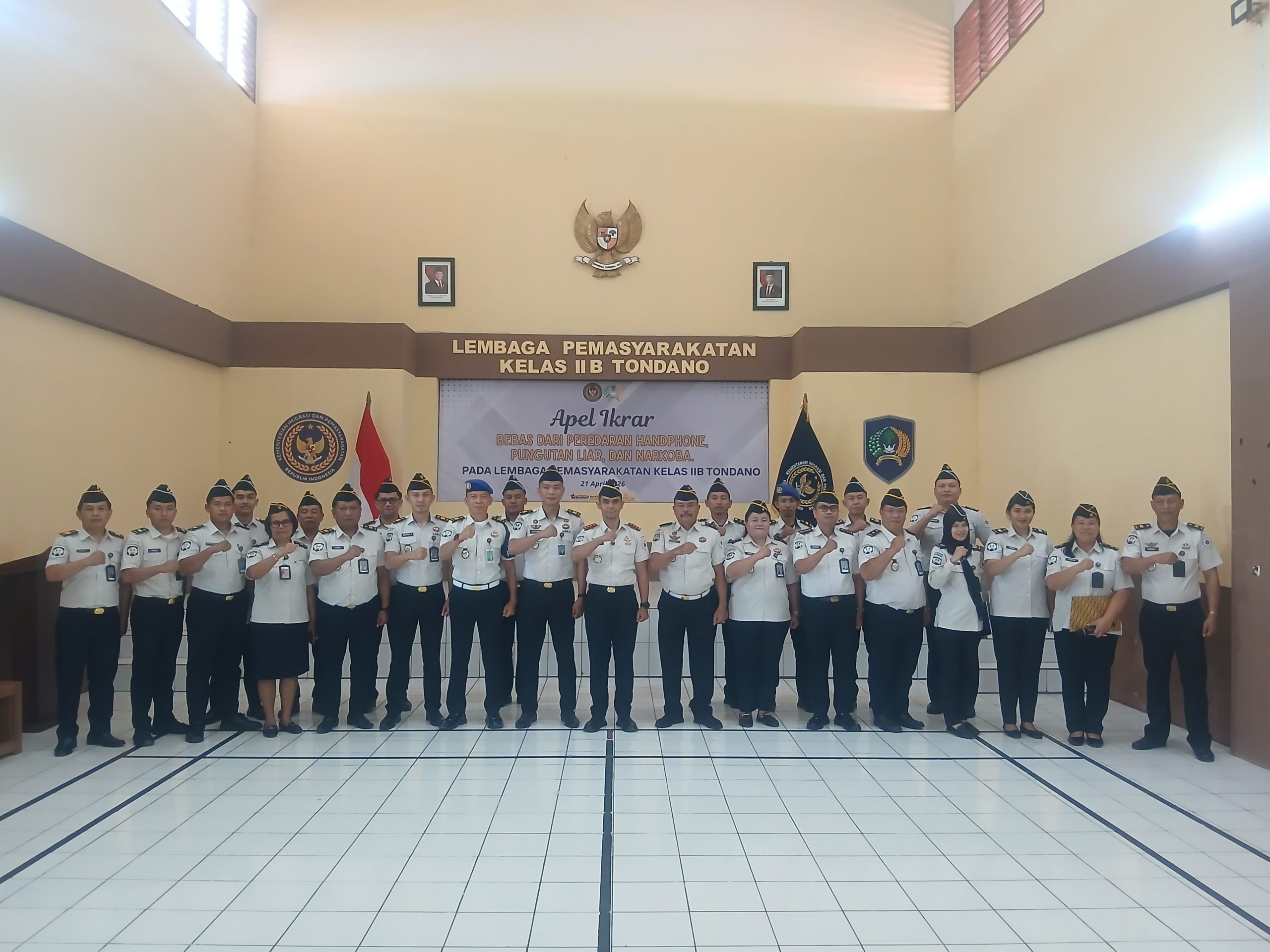 EKOMENTAR Lembaga Pemasyarakatan (Lapas) Kelas IIB Tondano melaksanakan kegiatan apel ikrar bebas dari peredaran handphone ilegal, pungutan liar (pungli), dan narkoba yang bertempat di Aula Dr. Sahardjo Lapas Tondano, Selasa (21/4).